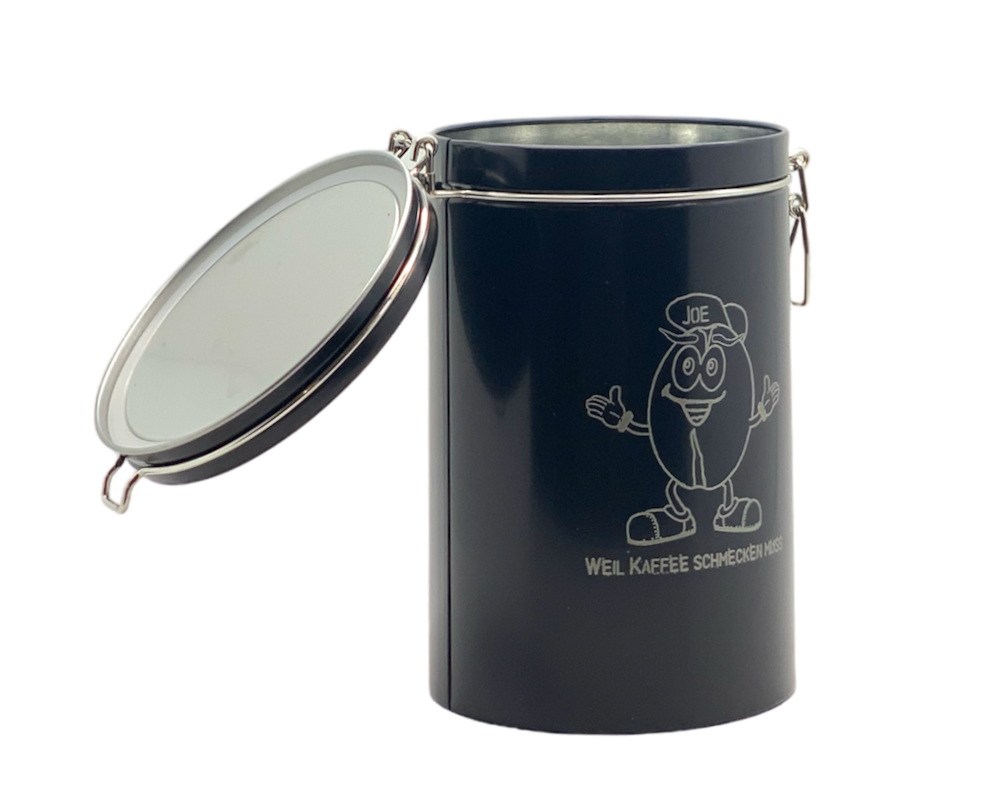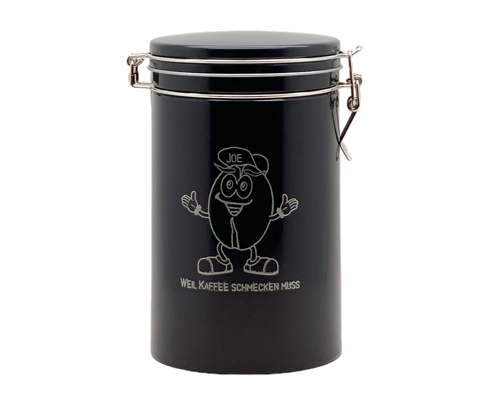 Die Dose besteht aus schwarz lackiertem Weißblech. Dank ihrem Bügelverschluss schafft sie einen dicht verschlossenen Stauraum für 450g Bohnen oder 500g gemahlener Kaffee. Aber diese Dose ist mehr als nur praktisch. Sie ist stilvoll schwarz lackiert und trägt eine Lasergravur auf ihrer Seite. Sie finden hier einerseits unseren Slogan „Weil Kaffee schmecken muss“, andererseits lächelt Ihnen unser Maskottchen, JOE die fröhliche Kaffeebohne, entgegen.