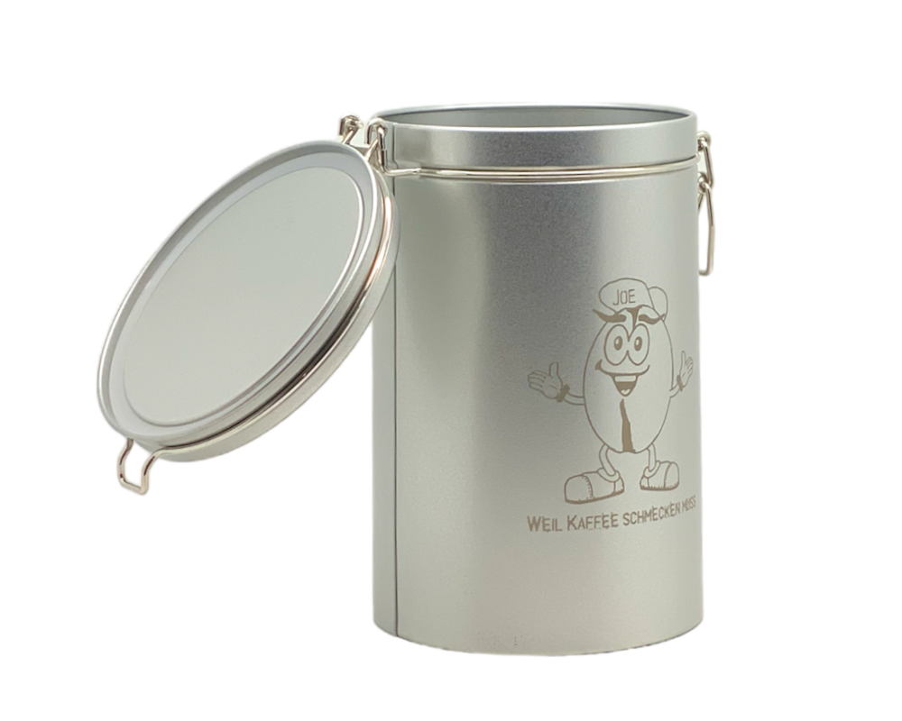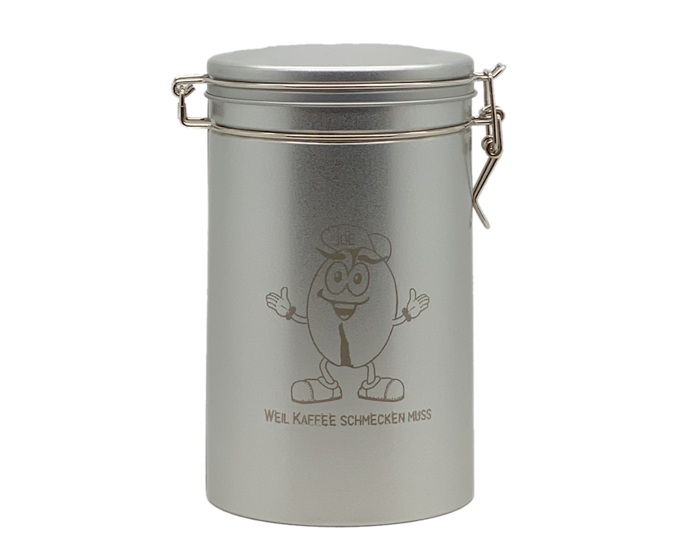 Die silbermatte Seite der Dose trägt unseren Slogan „Weil Kaffee schmecken muss“. Darüber grüßt mit bekannter Fröhlichkeit unsere Kaffeebohne JOE. Sowohl unser Slogan als auch unser JOE wurden mittels Lasergravur eingebracht. Die Bügelverschlussdose können Sie einfach mit einem leicht feuchten Tuch reinigen. Egal wie oft Sie das tun, unser JOE bleibt dort wo er ist, auf der Seite Ihrer Bügelverschlussdose.