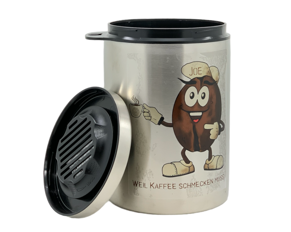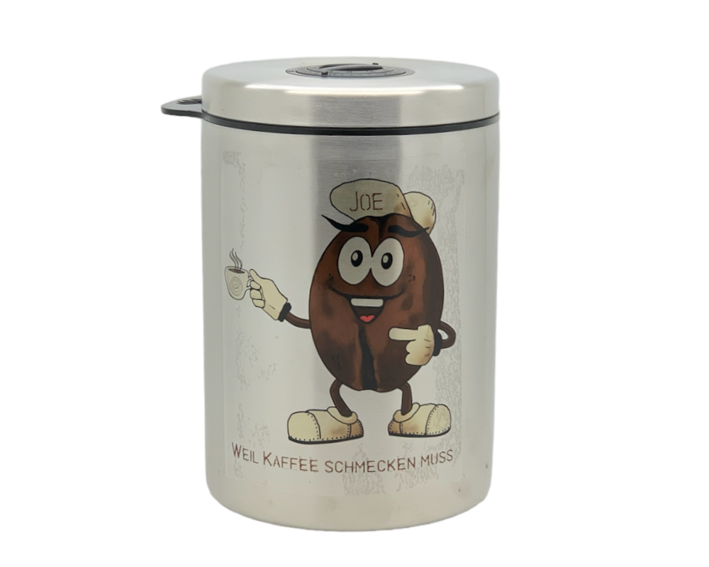 JOE ist begeistert und darf sich sogar auf der Seite dieser großen Kaffee 1kg Bohnen fassenden Dose präsentieren. Dieses Kaffee-Meisterwerk besteht aus hochwertigem Edelstahl. Auf dem Deckel befindet sich ein Drehknopf über den Sie Tag und Monat der Befüllung einstellen können. Der Deckel selbst ist mit nur einer viertel Drehung aromadicht verschlossen. Hier gehen raffiniertes Design und Qualität Hand in Hand.