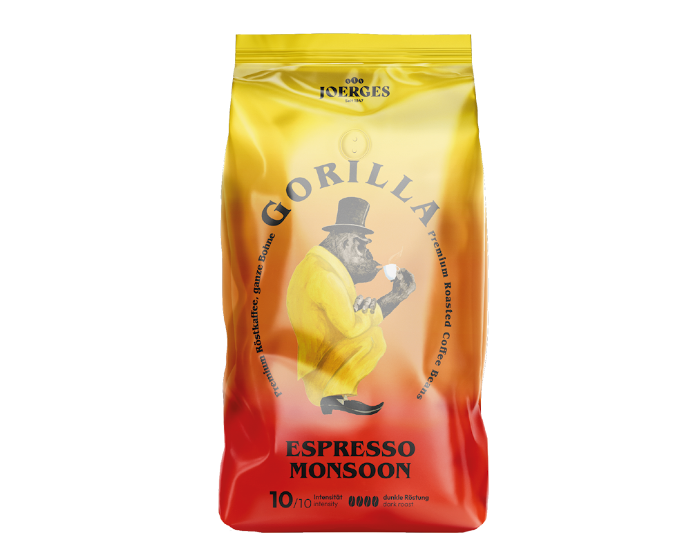 Mit seiner samtigen, festen Crema und seinem vollmundigen, intensiven Geschmack begeistert und belebt der Monsoon Espresso jedes Meeting. Diese Gorilla Kaffee Bohnen aus 100% Robusta überraschen mit ihrer fülligen Geschmacksvielfalt. Durch seine dunkle Röstung, unterstreichen Sie Ihren Espresso oder Cappuccino mit feinen Nuss- und Schokoladennoten. Durch das sehr langsame und schonende Trommelröstverfahren der Rösterei Joerges entfaltet der Monsoon Espresso einen erlesenen Geschmack, der den Gaumen verwöhnt und die Sinne belebt.