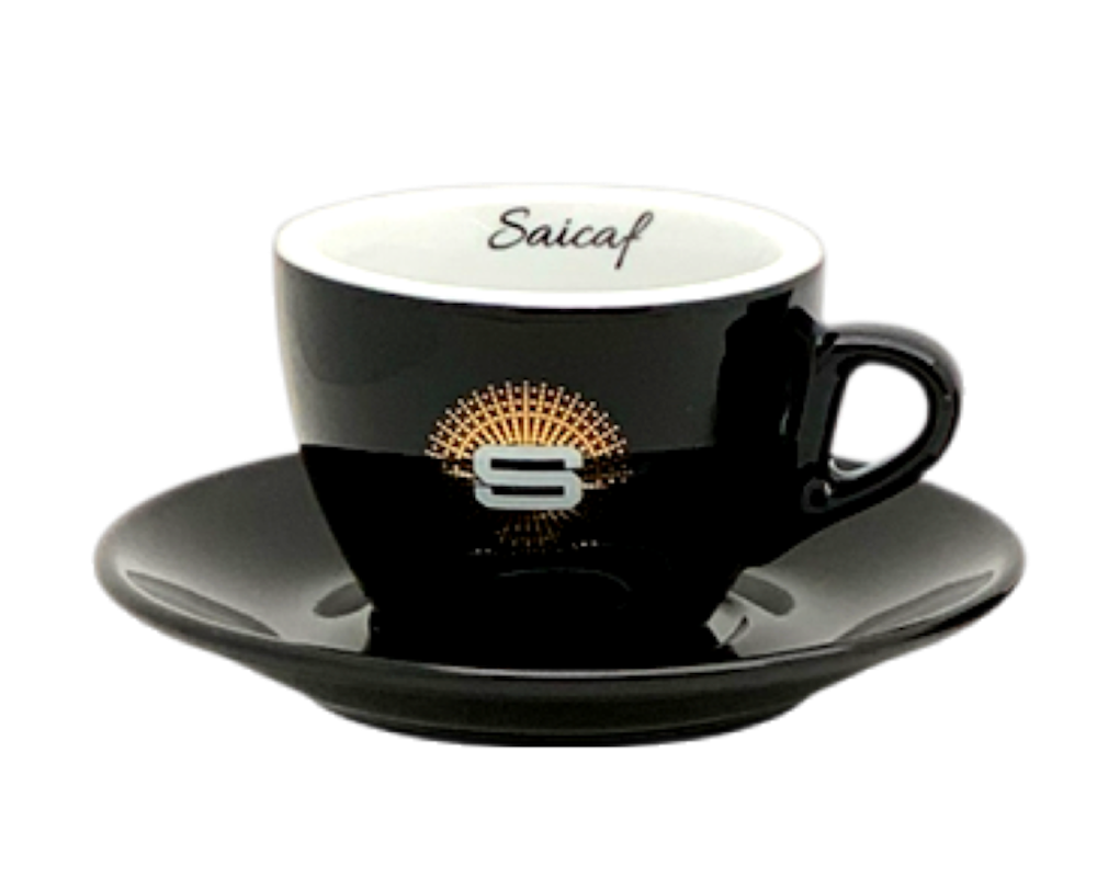 Die schwarze Saicaf Kreation verkörpert zeitloses Design und feine Eleganz. Sie hat einen Durchmesser von etwa 84 mm und liegt gut in der Hand. Ihr tiefschwarzes Äußere ist mit einem weiß-goldenem Saicaf Logo verziert. Innen wurde diese Cappuccino Tasse weiß belassen und trägt passend zum zeitlosen schwarz-weißen Design einen schwarzen Saicaf Schriftzug.