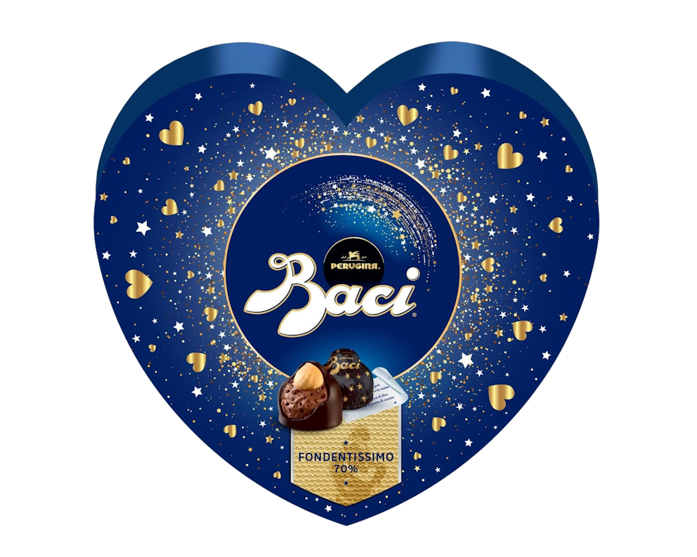 Die dunklen Fondentissimo von Baci® Perugina® gibt es jetzt auch in nachtblauer Herzschachtel. Beschenken Sie sich, geschätzte Kollegen, Freunde oder Ihren Partner mit diesen traditionsreichen, echt italienischen Pralinen. Jede der 8 Pralinen ist in ein nachtblaues, sternenverziertes Papier eingeschlagen und trägt romantische Poesie bei sich. Die Herzschachtel ist bereits eine stilvolle Verpackung. – Fertig zum Verschenken.